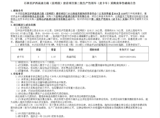 石林至泸西高速公路(昆明段)建设项目第二批生产性用车(皮卡车)采购竞争性磋商公告