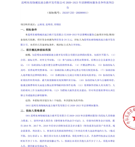 昆明东南绕城高速公路开发有限公司2020-2023年法律顾问服务竞争性谈判公告