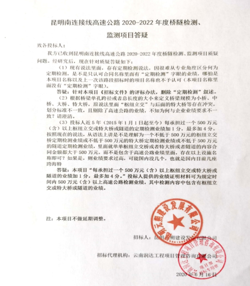 昆明南连接线高速公路2020-2022年度桥隧检测、监测项目答疑