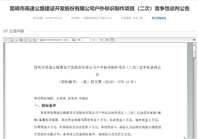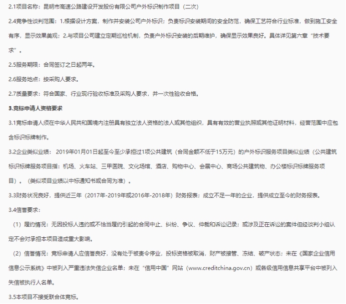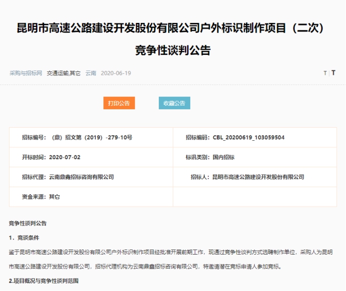昆明市高速公路建设开发股份有限公司户外标识制作项目(二次)竞争性谈判公告