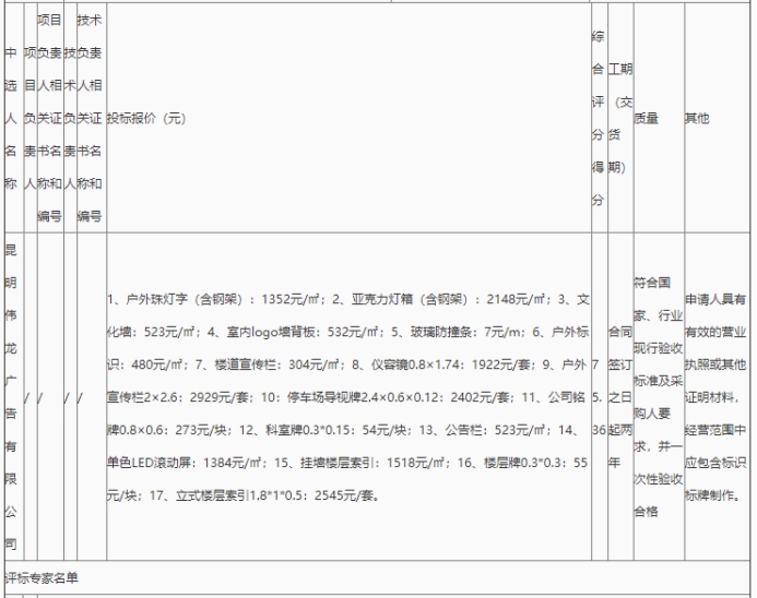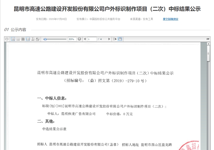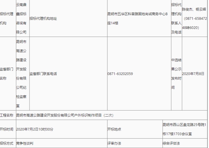 昆明市高速公路建设开发股份有限公司户外标识制作项目(二次)中标结果公示