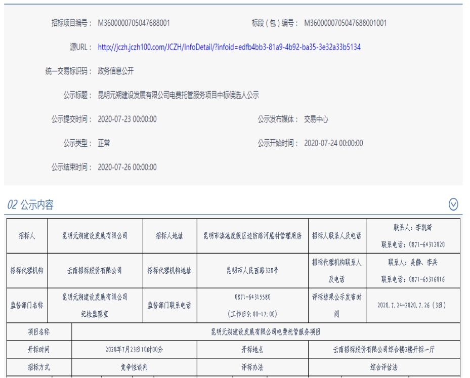 昆明元朔建设发展有限公司电费托管服务项目评标结果公示