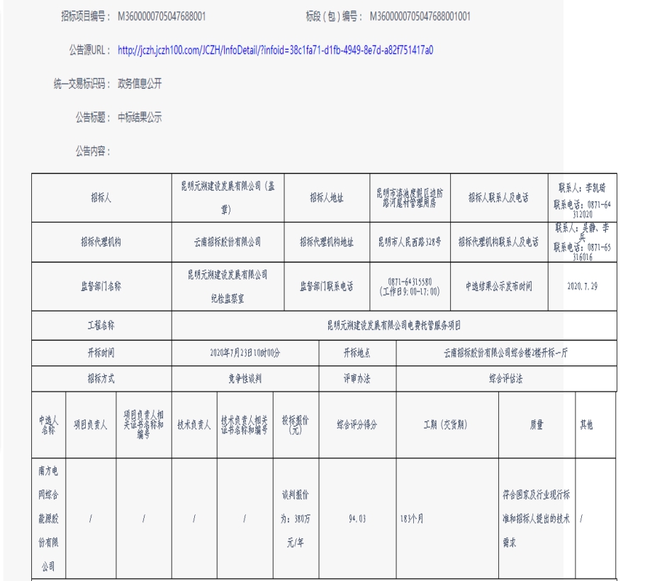 昆明元朔建设发展有限公司电费托管服务项目中标结果公示