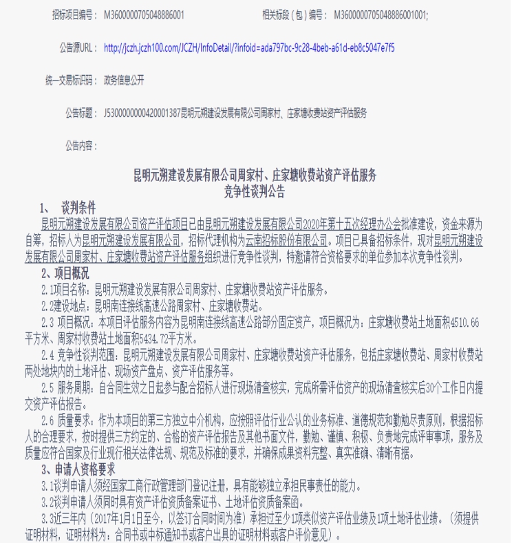 昆明元朔建设发展有限公司周家村、庄家塘收费站资产评估服务竞争性谈判公告