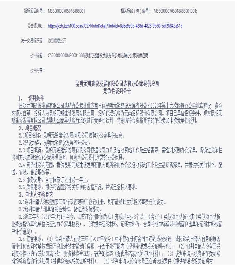 昆明元朔建设发展有限公司选聘办公家具供应商竞争性谈判公告
