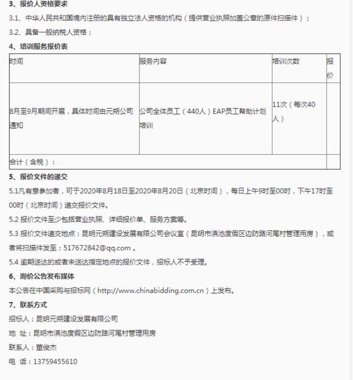 昆明元朔建设发展有限公司2020年企业EAP员工帮助计划培训市场询价公告