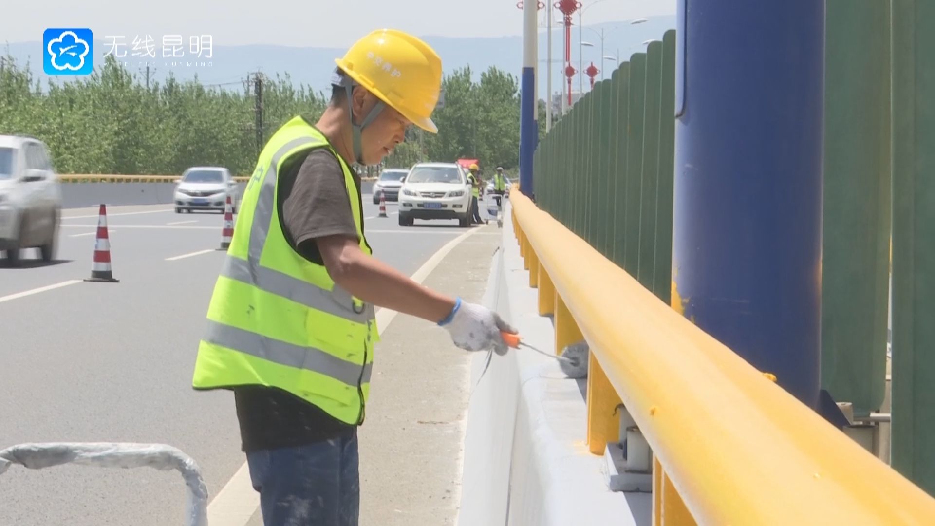 工人正在给护栏刷油漆