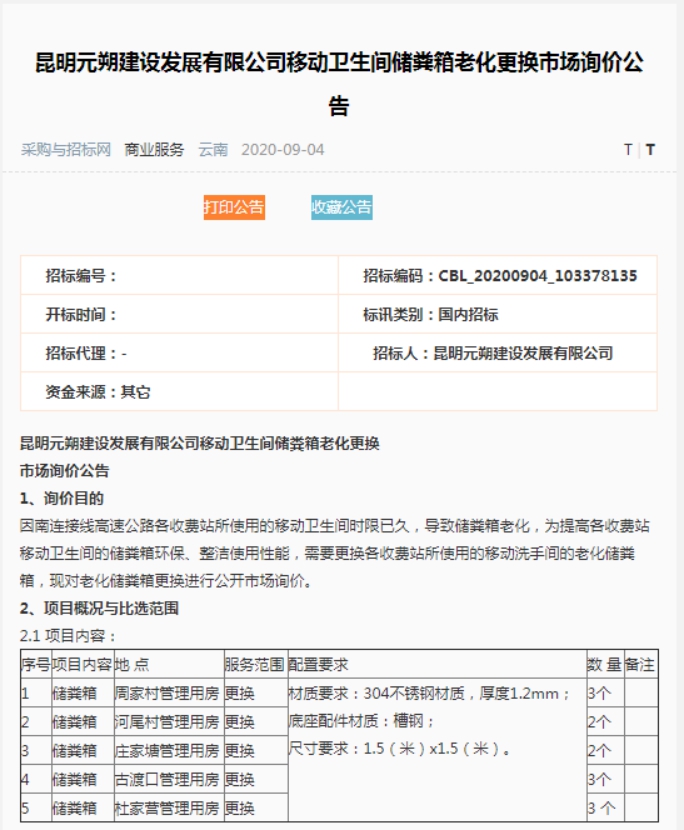 昆明元朔建设发展有限公司移动卫生间储粪箱老化更换市场询价公告