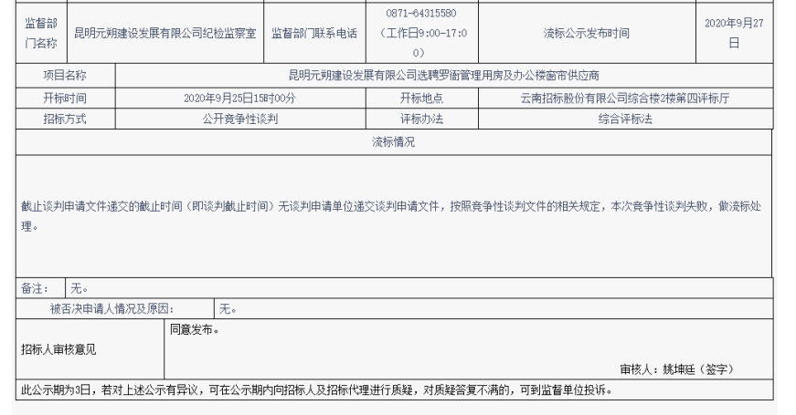 昆明元朔建设发展有限公司选聘罗衙管理用房及办公楼窗帘供应商流标公示
