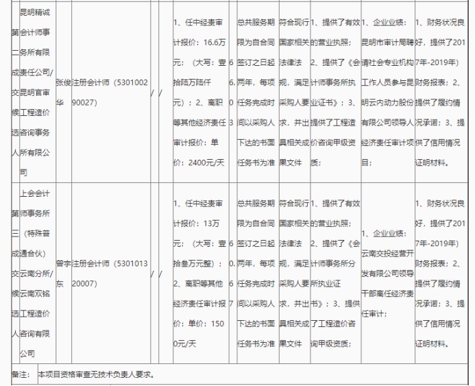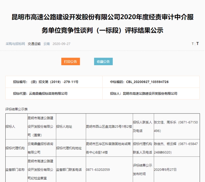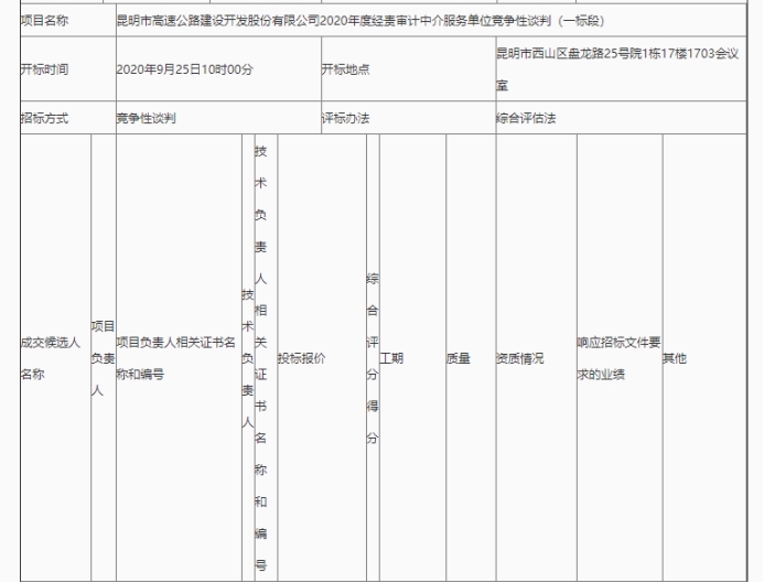 昆明市高速公路建设开发股份有限公司2020年度经责审计中介服务单位竞争性谈判(一标段)评标结果公示
