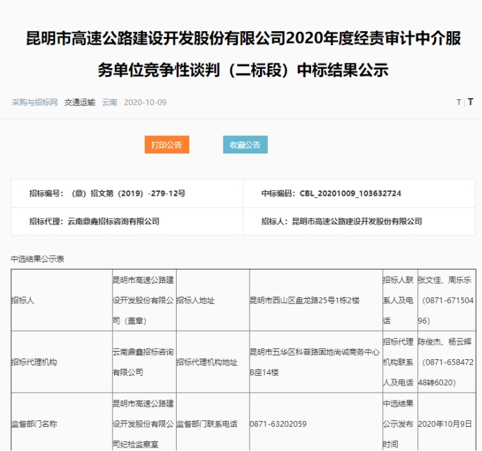 昆明市高速公路建设开发股份有限公司2020年度经责审计中介服务单位竞争性谈判(二标段)中标结果公示