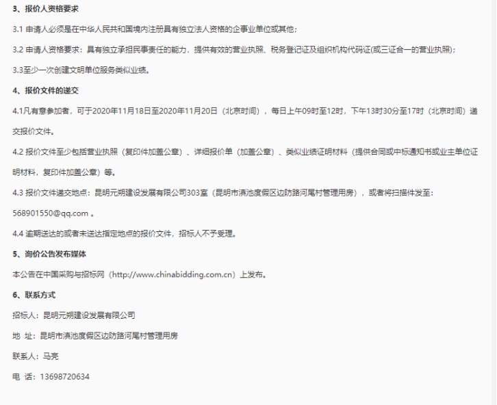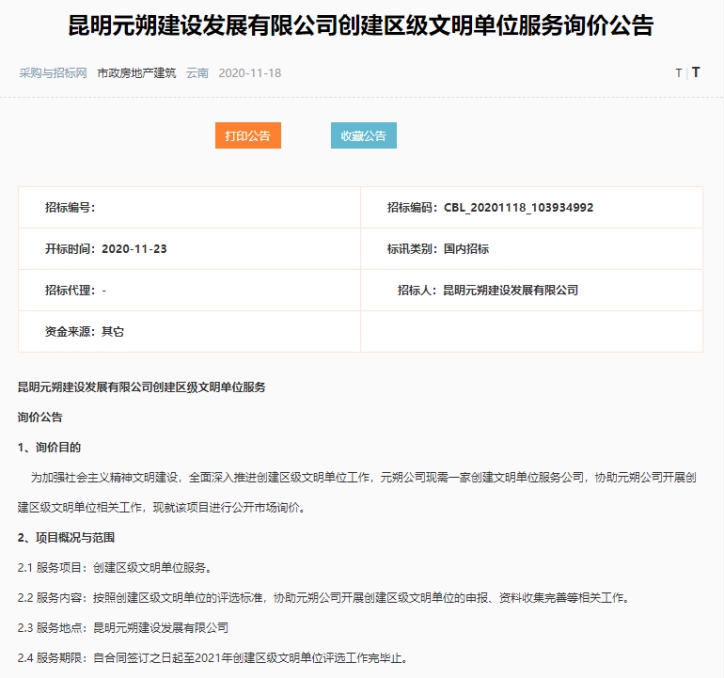 昆明元朔建设发展有限公司创建区级文明单位服务询价公告