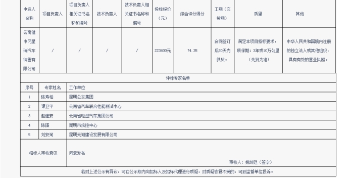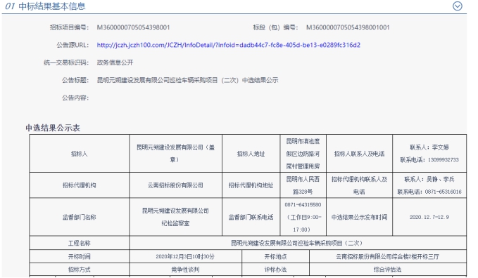 昆明元朔建设发展有限公司巡检车辆采购项目(二次)中标结果公示