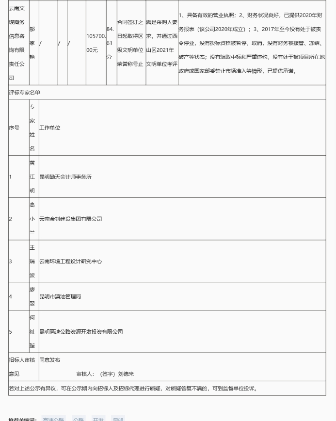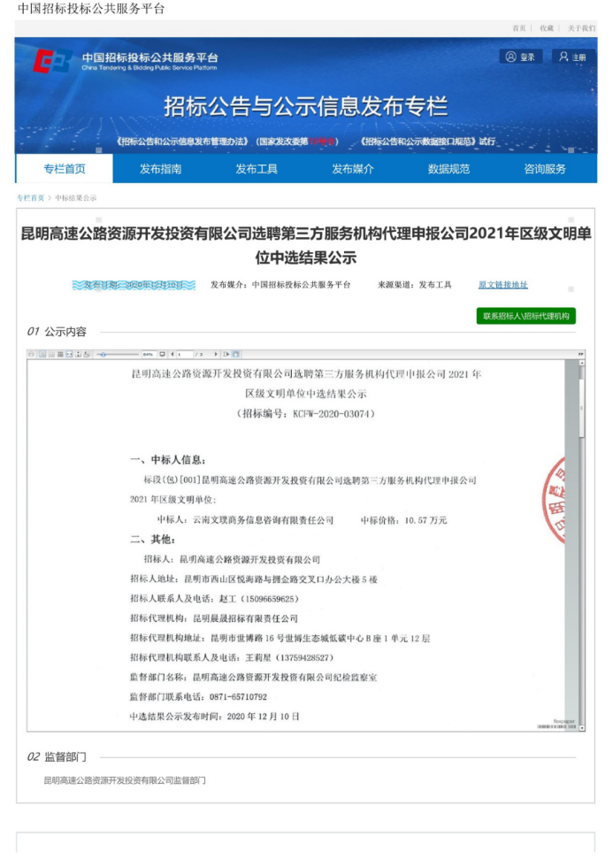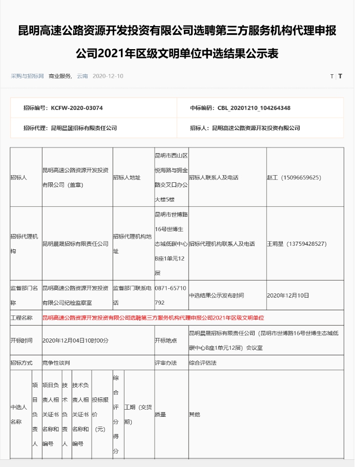 昆明高速公路资源开发投资有限公司选聘第三方服务机构代理申报公司2021年区级文明单位竞争性谈判中标结果公示