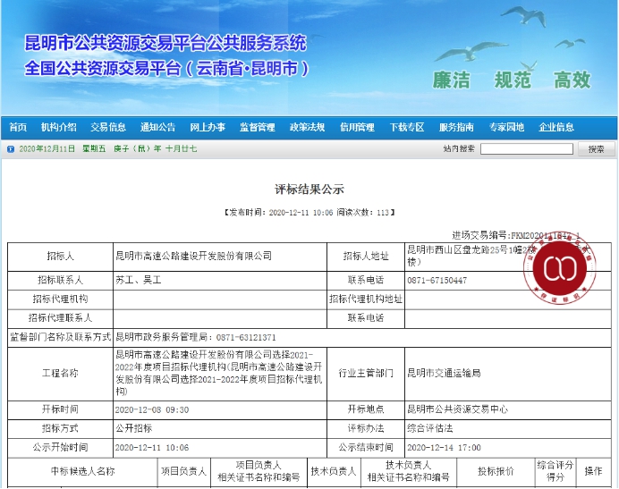 昆明市高速公路建设开发股份有限公司选择2021-2022年度项目招标代理机构评标结果公示