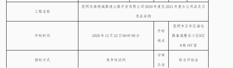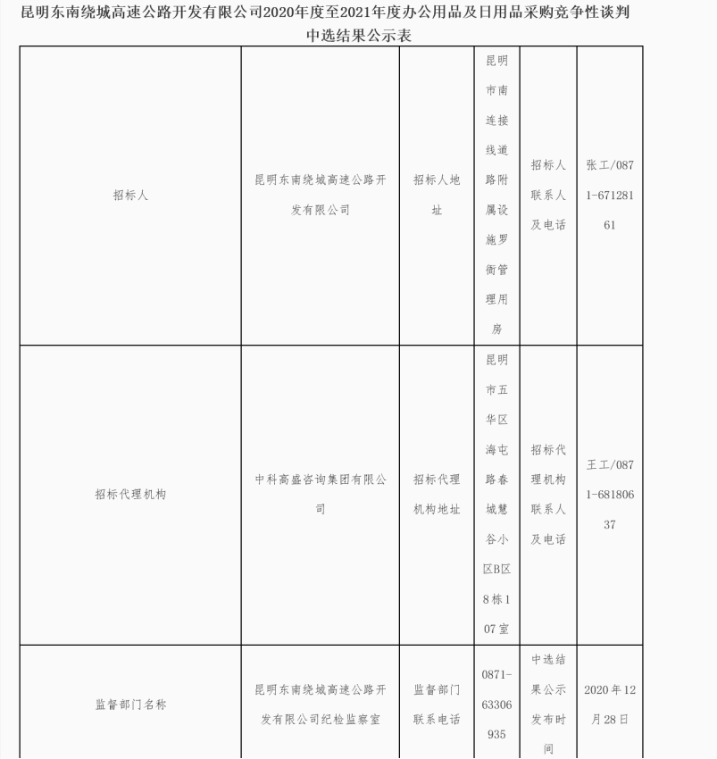 昆明东南绕城高速公路开发有限公司2020年度至2021年度办公用品及日用品采购竞争性谈判成交结果公示