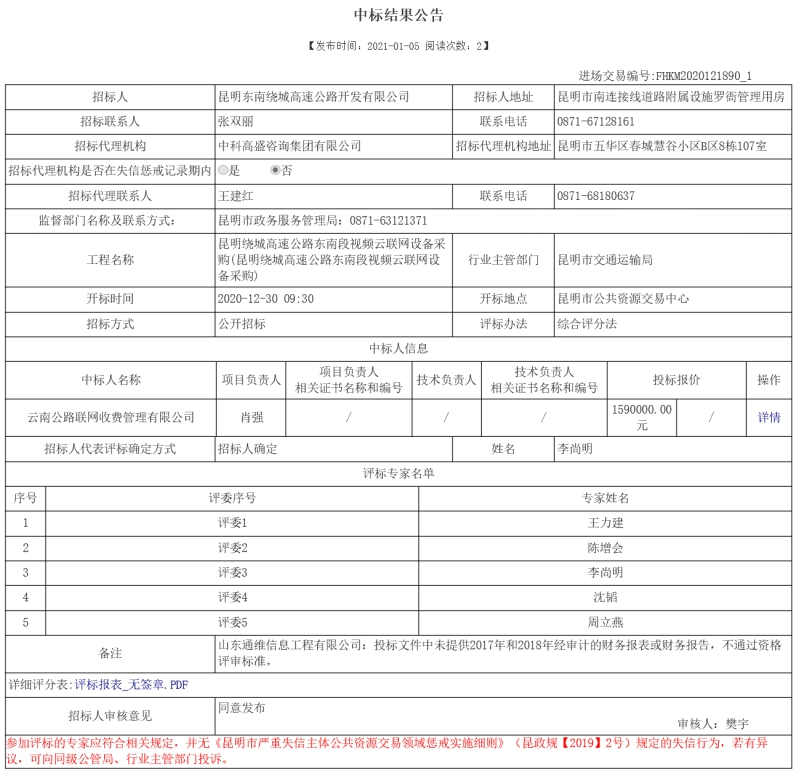 昆明绕城高速公路东南段视频云联网设备采购中标结果公示