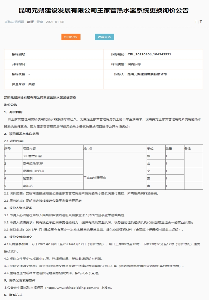 昆明元朔建设发展有限公司王家营热水器系统更换询价公告