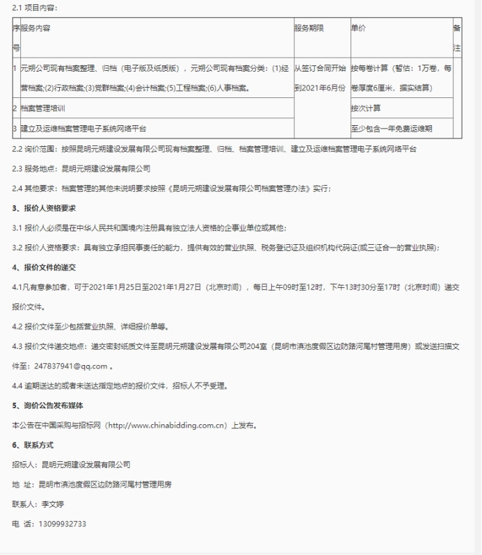 昆明元朔建设发展有限公司档案管理服务项目市场询价公告(二次)