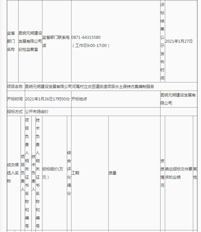 昆明元朔建设发展有限公司河尾村立交匝道改造项目水土保持方案编制服务评标结果公示
