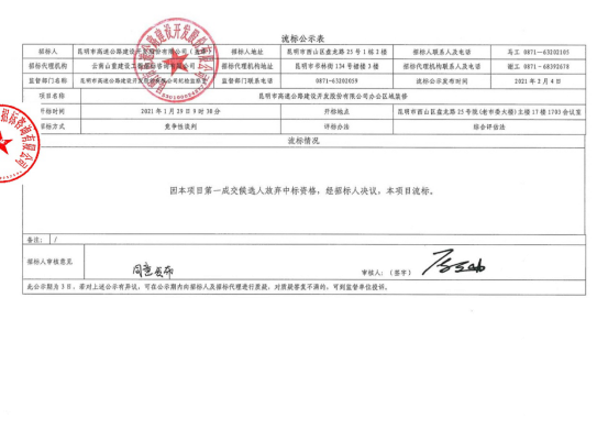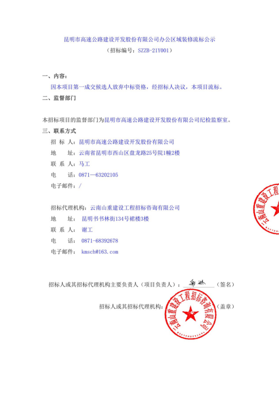 昆明市高速公路建设开发股份有限公司办公区域装修流标公示