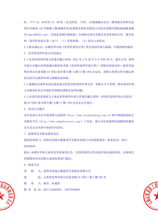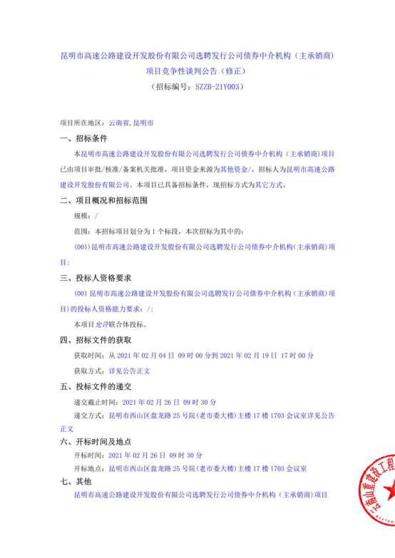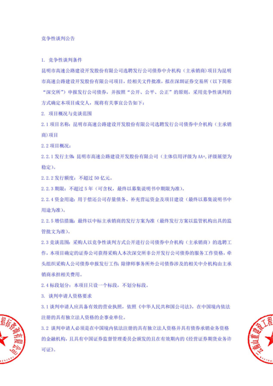 昆明市高速公路建设开发股份有限公司选聘发行公司债券中介机构(主承销商)项目竞争性谈判公告