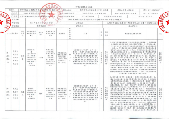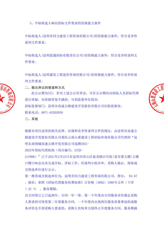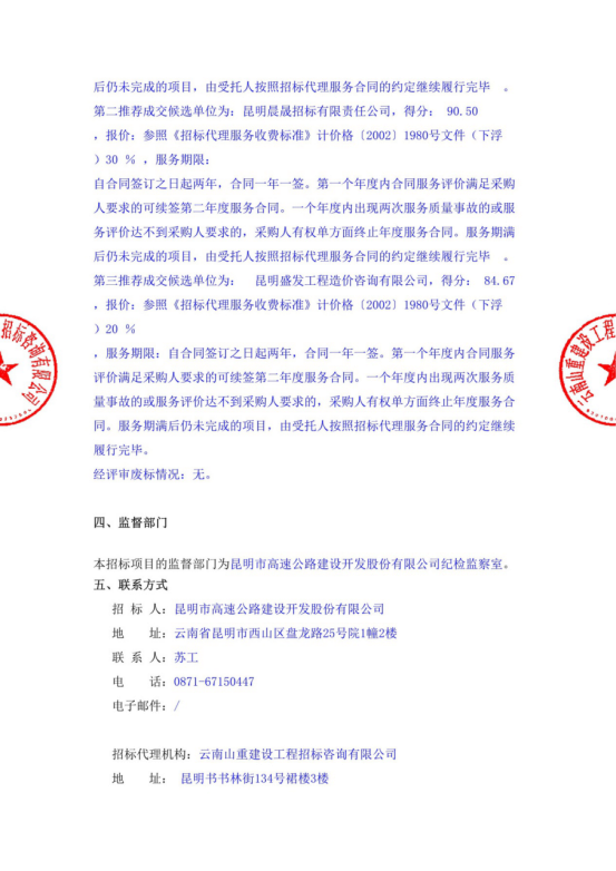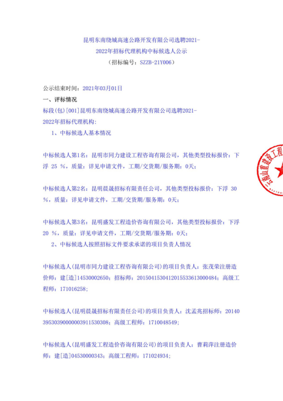 昆明东南绕城高速公路开发有限公司选聘2021-2022年招标代理机构评标结果公示