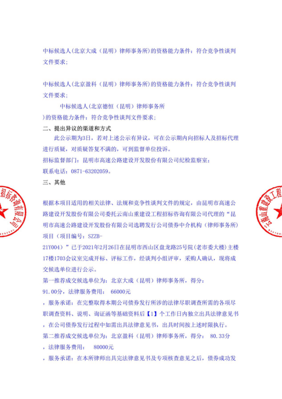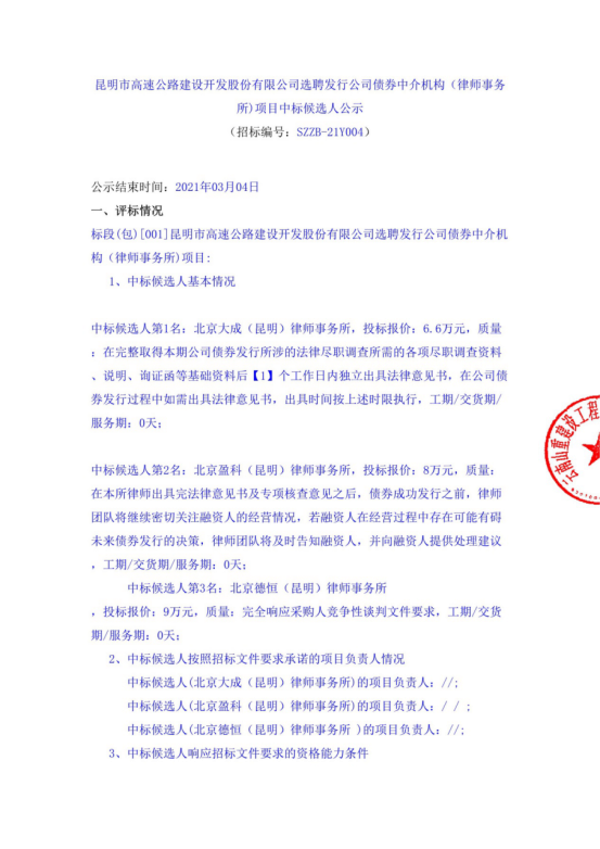 昆明市高速公路建设开发股份有限公司选聘发行公司债券中介机构(律师事务所)项目评标结果公示