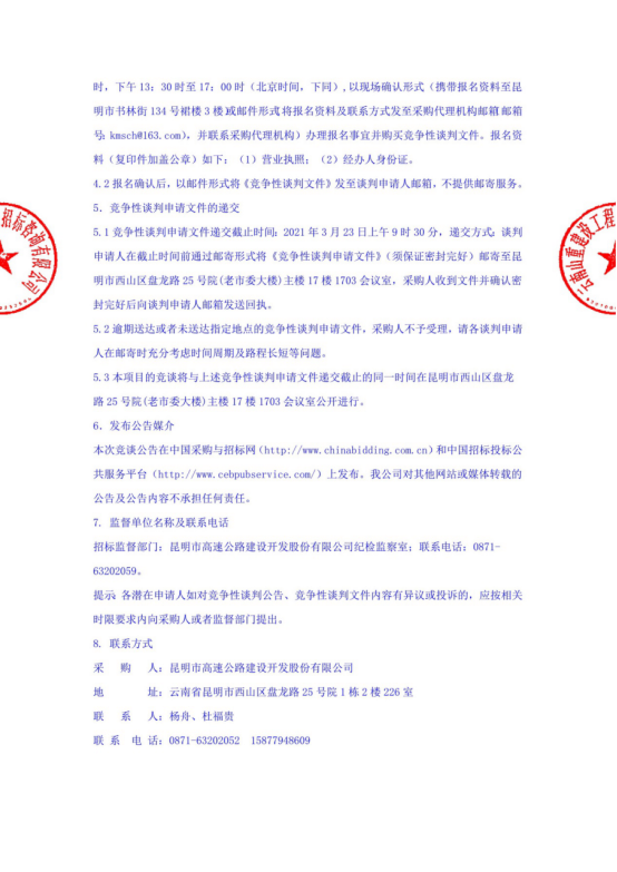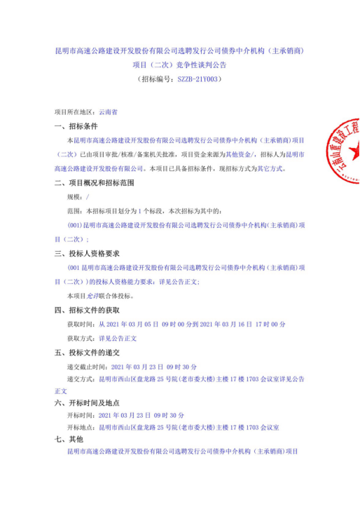 昆明市高速公路建设开发股份有限公司选聘发行公司债券中介机构(主承销商)项目(二次)竞争性谈判公告