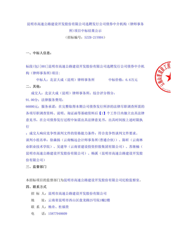 昆明市高速公路建设开发股份有限公司选聘发行公司债券中介机构(律师事务所)项目中标结果公示