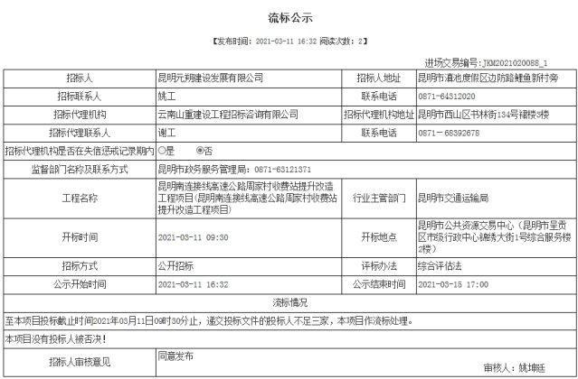 昆明南连接线高速公路周家村收费站提升改造工程项目流标公示