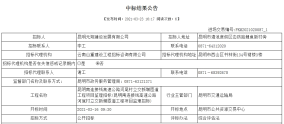 昆明南连接线高速公路河尾村立交新增匝道工程项目监理招标中标结果公示