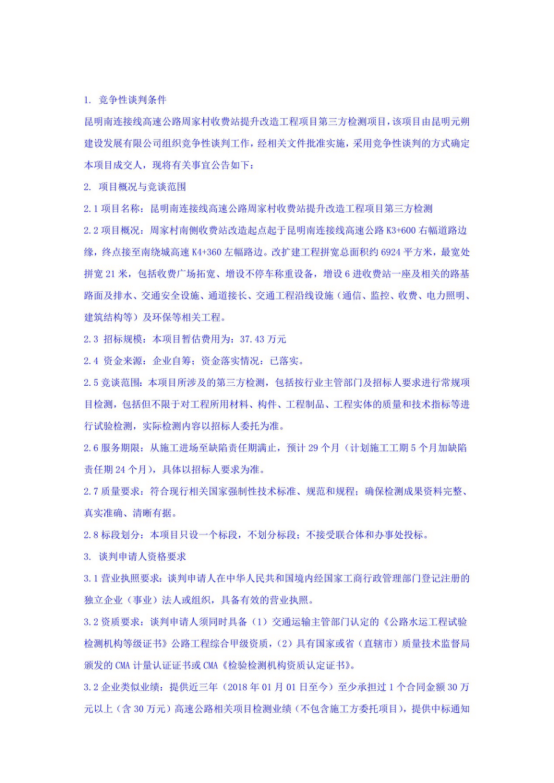 昆明南连接线高速公路周家村收费站提升改造工程项目第三方检测竞争性谈判公告