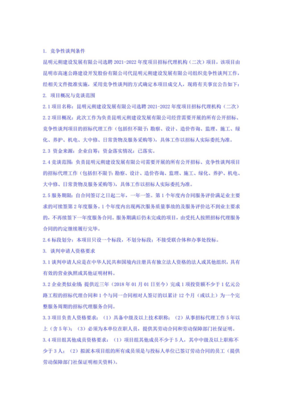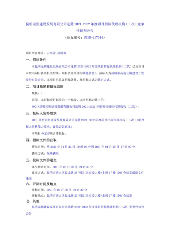 昆明元朔建设发展有限公司选聘2021-2022年度项目招标代理机构(二次)竞争性谈判公告