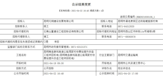 昆明南连接线高速公路周家村收费站提升改造工程项目机电评标结果公示
