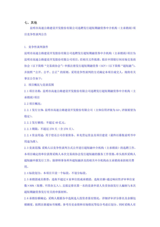 昆明市高速公路建设开发股份有限公司选聘发行超短期融资券中介机构(主承销商)项目竞争性谈判公告