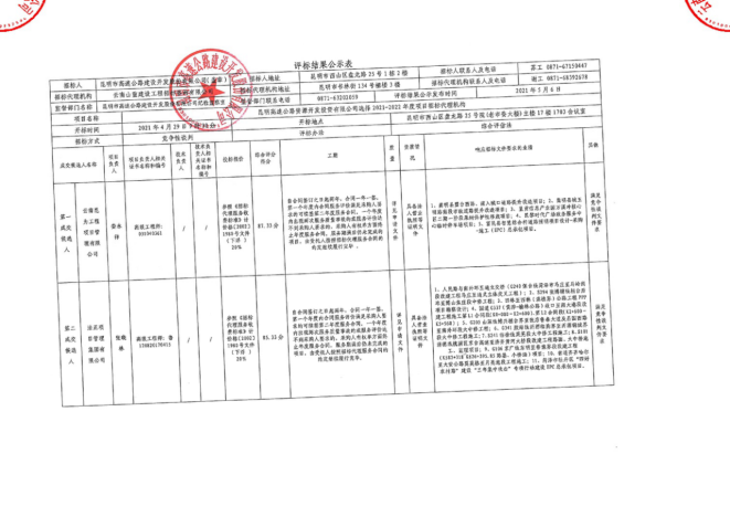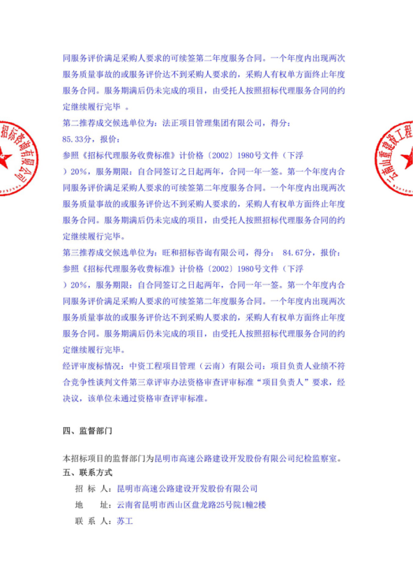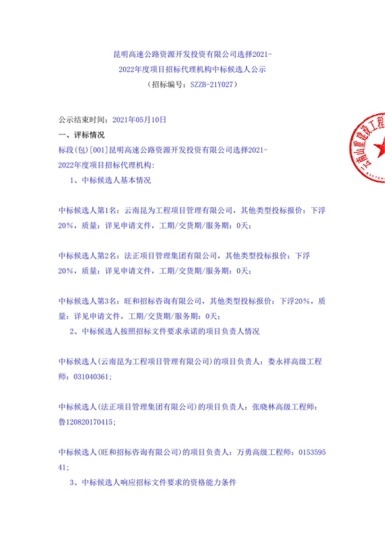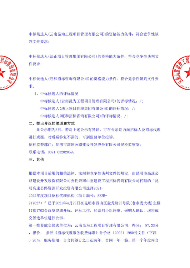 昆明高速公路资源开发投资有限公司选择2021-2022年度项目招标代理机构中标候选人公示