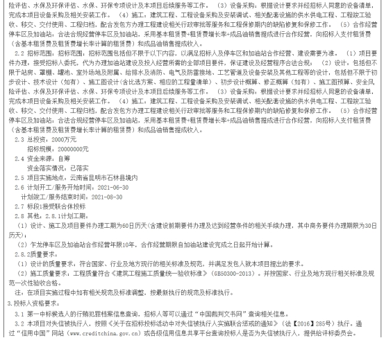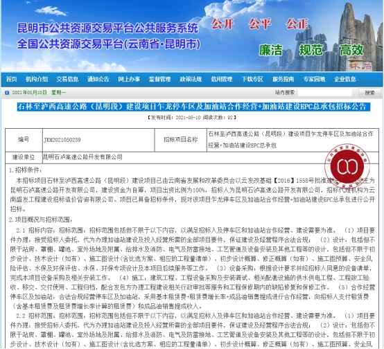 石林至泸西高速公路(昆明段)建设项目乍龙停车区及加油站合作经营+加油站建设EPC总承包招标公告