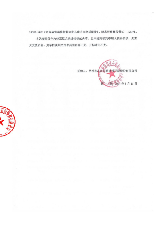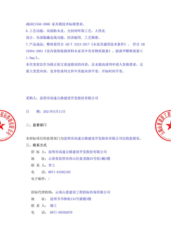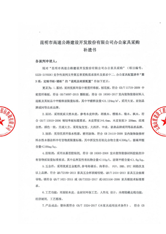 昆明市高速公路建设开发股份有限公司办公家具采购补遗书