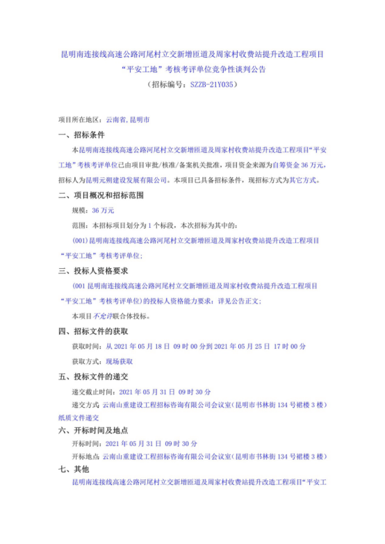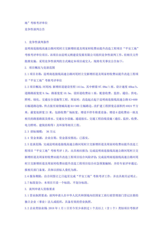 昆明南连接线高速公路河尾村立交新增匝道及周家村收费站提升改造工程项目“平安工地”考核考评单位竞争性谈判公告