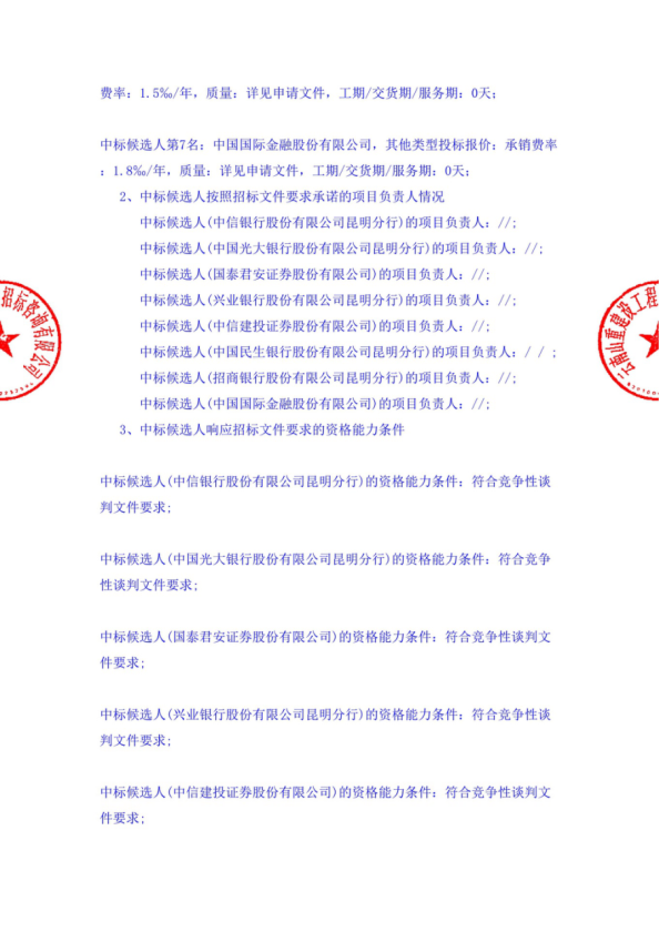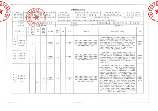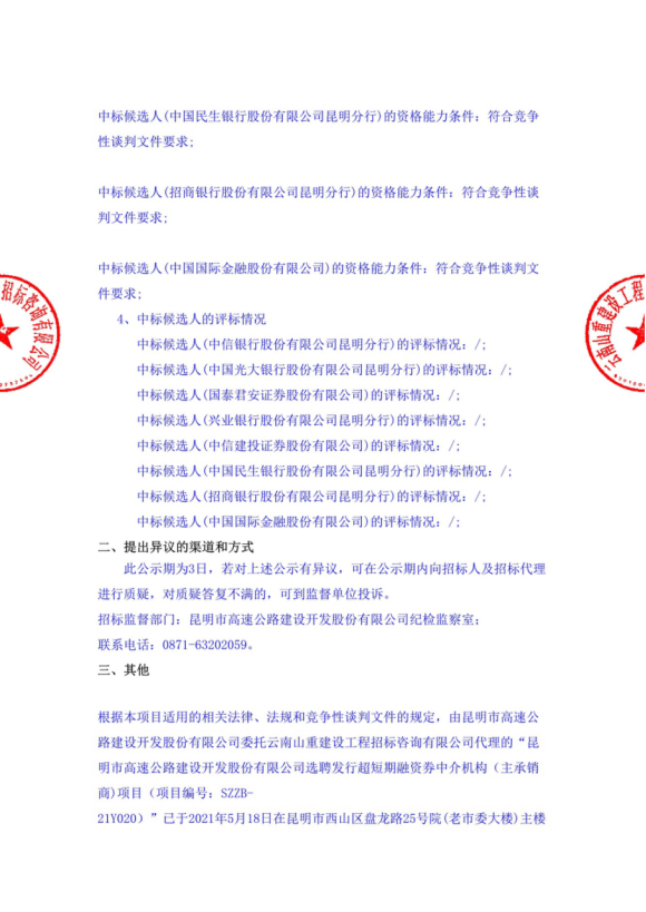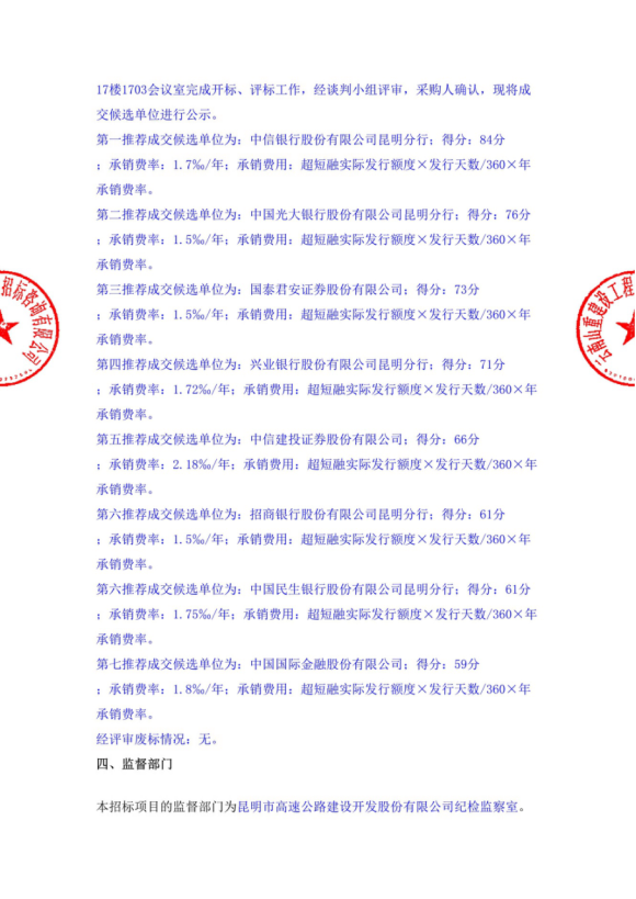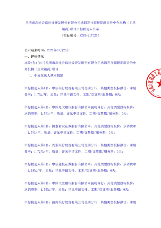 昆明市高速公路建设开发股份有限公司选聘发行超短期融资券中介机构(主承销商)项目中标候选人公示