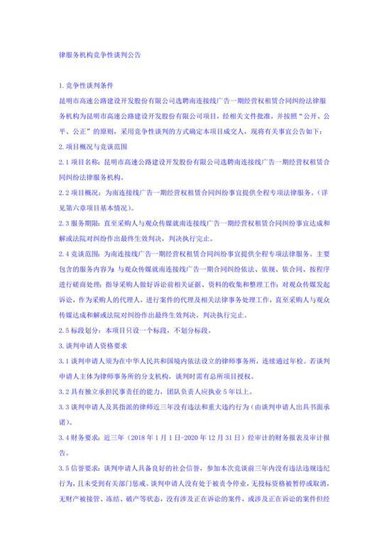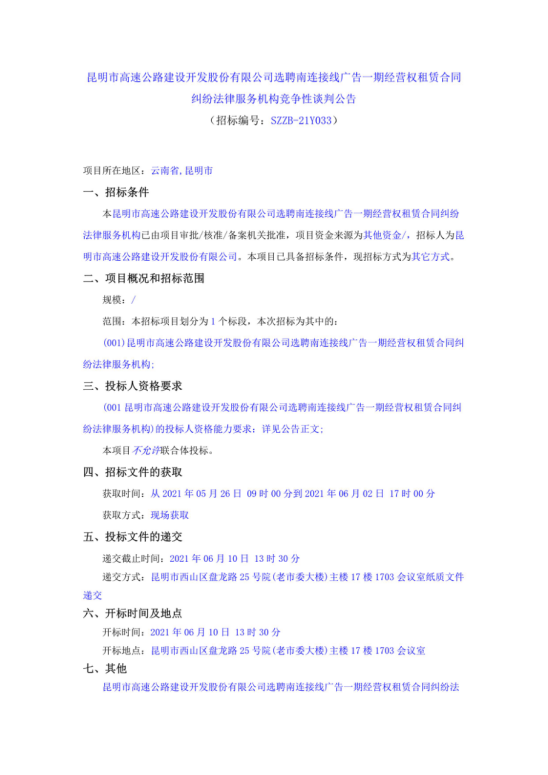 昆明市高速公路建设开发股份有限公司选聘南连接线广告一期经营权租赁合同纠纷法律服务机构竞争性谈判公告