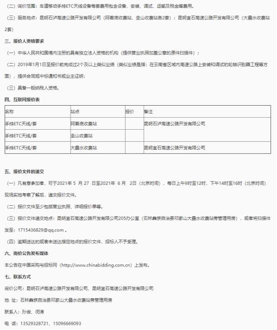 昆明宜石高速公路开发有限公司、昆明石泸高速公路开发有限公司关于手持ETC天线的市场询价公告