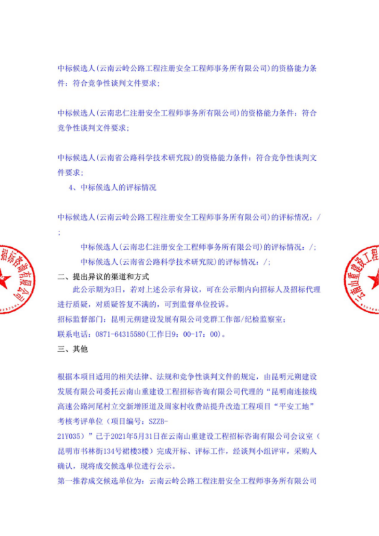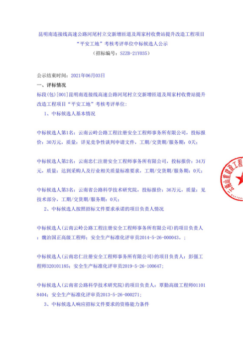 昆明南连接线高速公路河尾村立交新增匝道及周家村收费站提升改造工程项目“平安工地”考核考评单位中标候选人公示