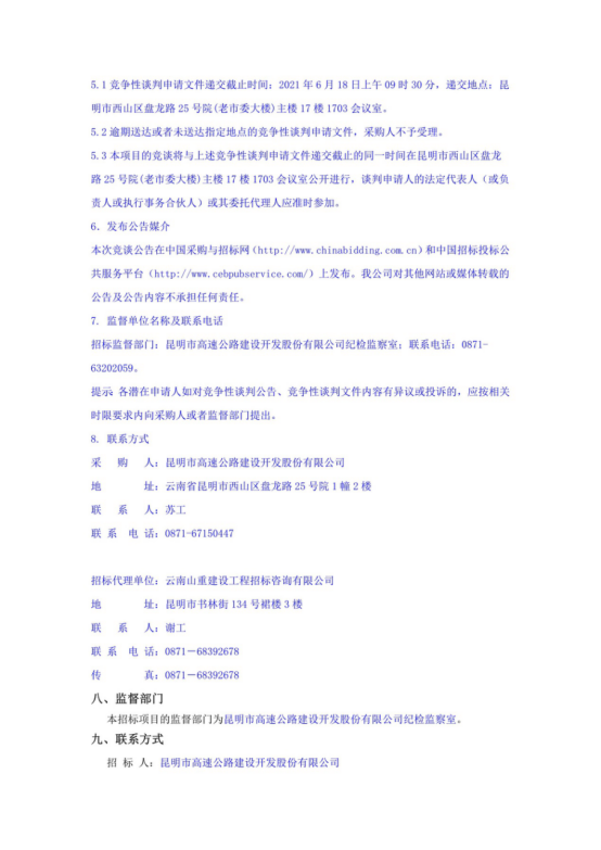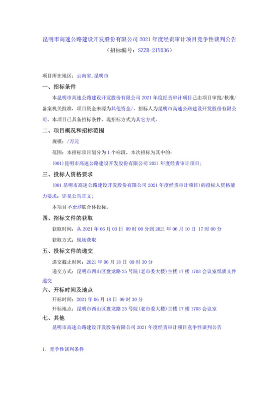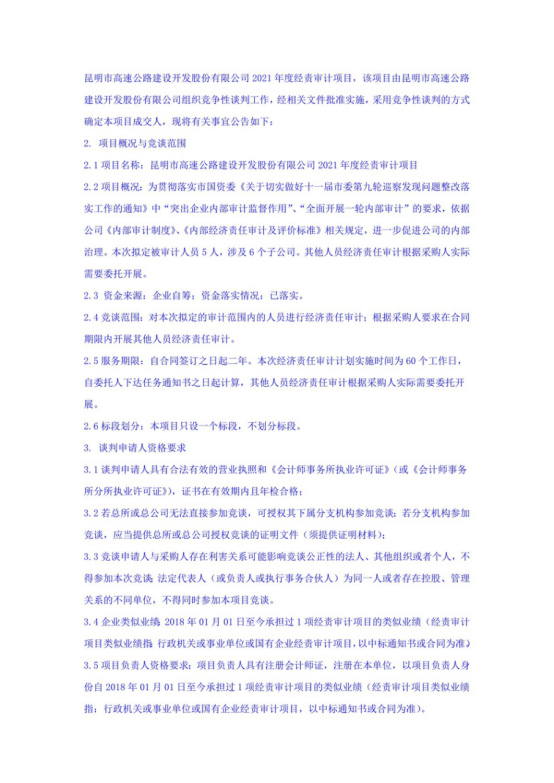 昆明市高速公路建设开发股份有限公司2021年度经责审计项目竞争性谈判公告