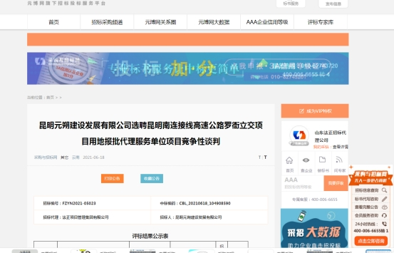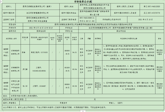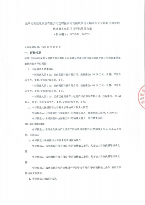 昆明元朔建设发展有限公司选聘昆明南连接线高速公路罗衙立交项目用地报批代理服务单位项目评标结果公示