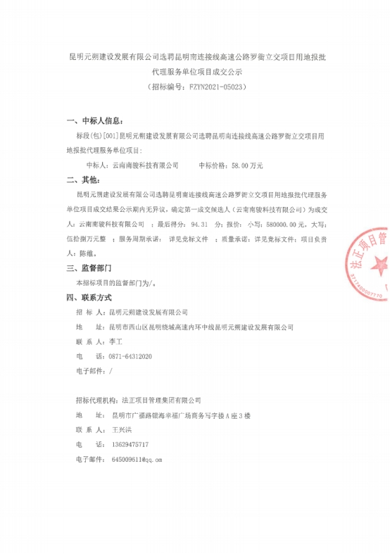 昆明元朔建设发展有限公司选聘昆明南连接线高速公路罗衙立交项目用地报批代理服务单位项目成交结果公示