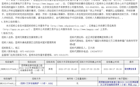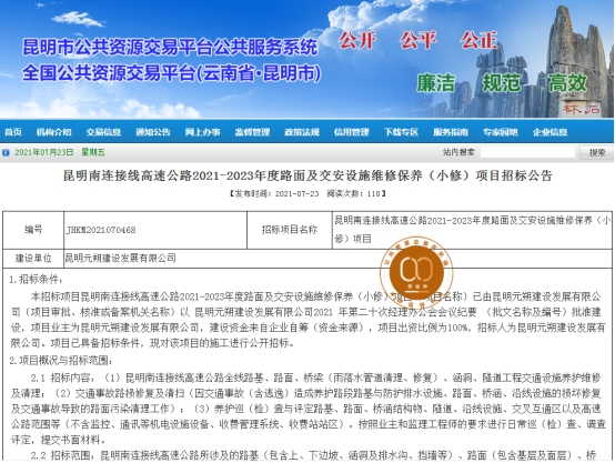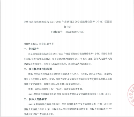 昆明南连接线高速公路2021-2023年度路面及交安设施维修保养(小修)项目招标公告
