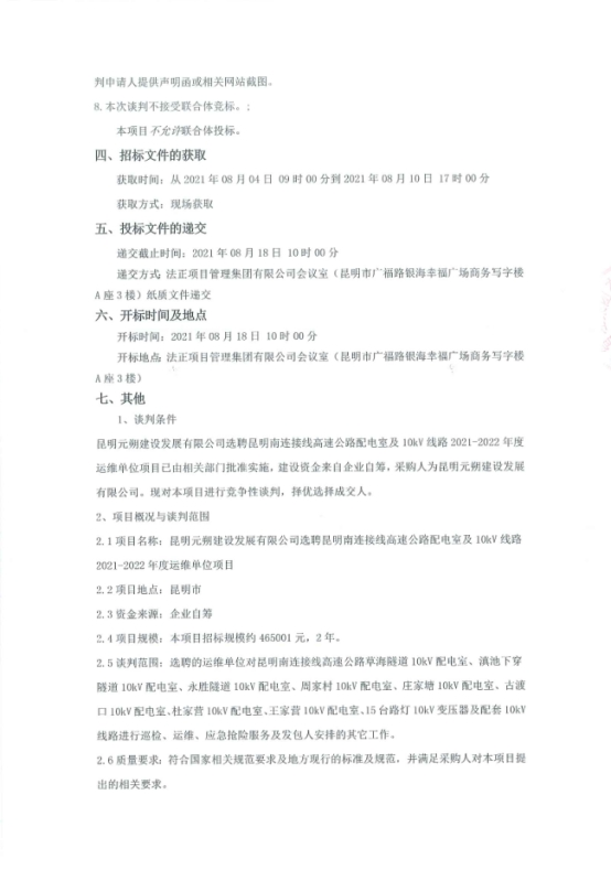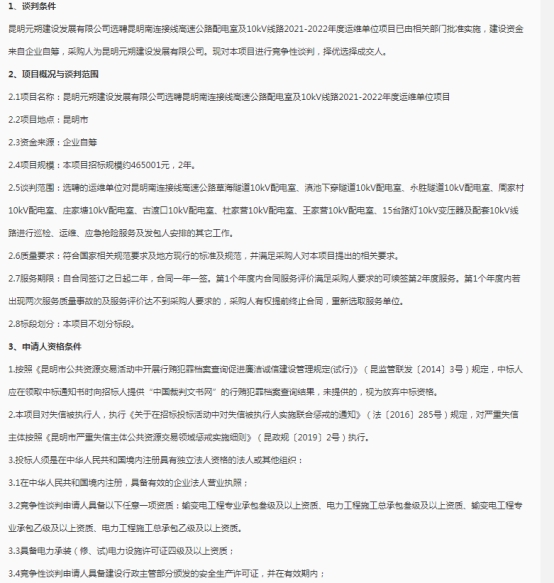 昆明元朔建设发展有限公司选聘昆明南连接线高速公路配电室及10kV线路2021-2022年度运维单位项目(二次)竞争性谈判公告
