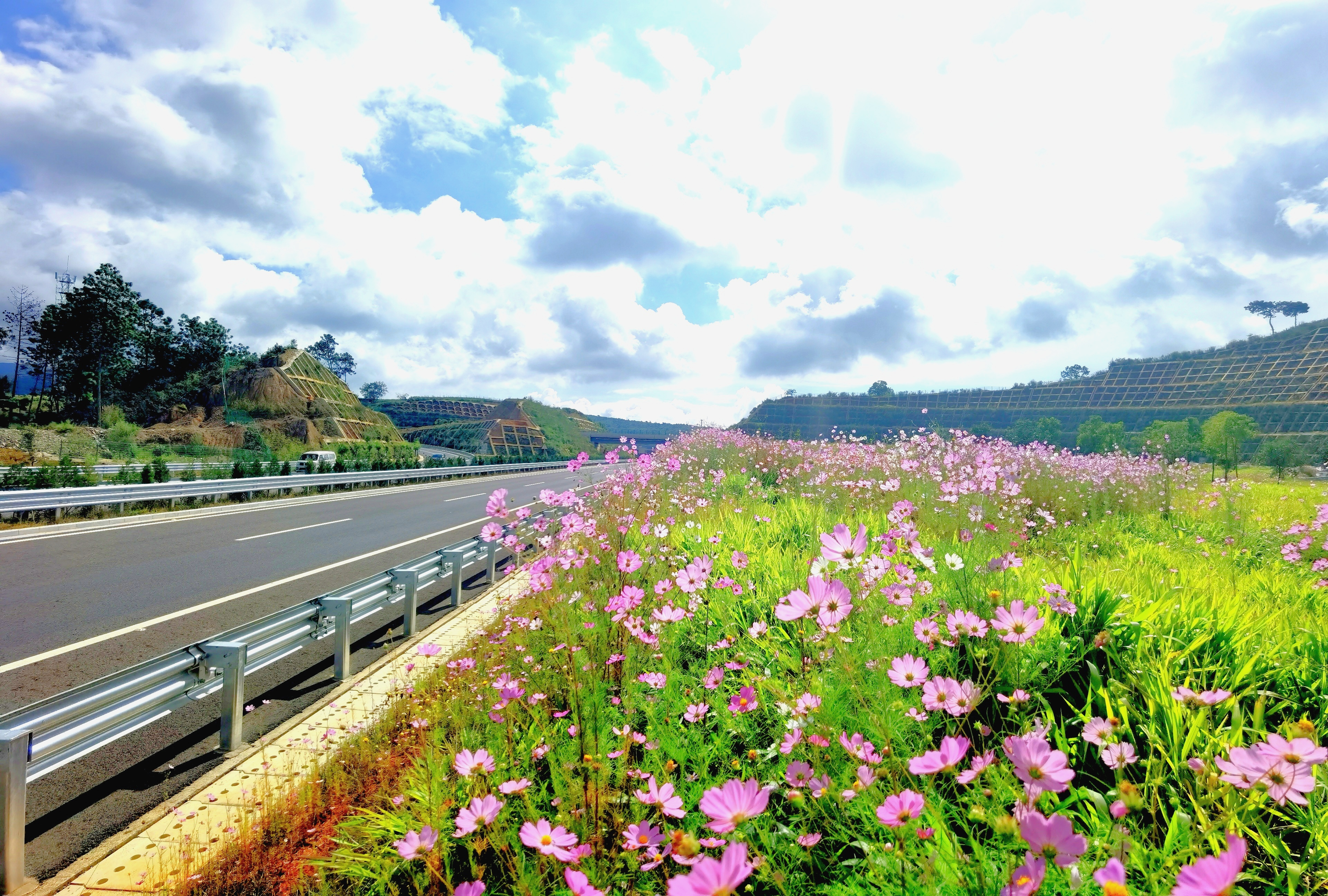 自今年3月起,为把石泸高速公路(昆明段)沿线打造成为路景融合、风景优美、自然和谐的绿色风景线,石泸公司不断完善石林至泸西高速公路(昆明段)绿化配套设施积极开展补植补栽工作,在路侧种植蓝花楹、香樟等共计1700余棵,上下边坡、互通区补植补栽格桑花、坡柳等10万余平方米,现路侧乔木生长良好,沿途格桑花竞相怒放、蝶舞丛生。